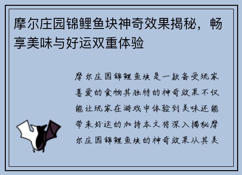摩尔庄园锦鲤鱼块神奇效果揭秘,畅享美味与好运双重体验